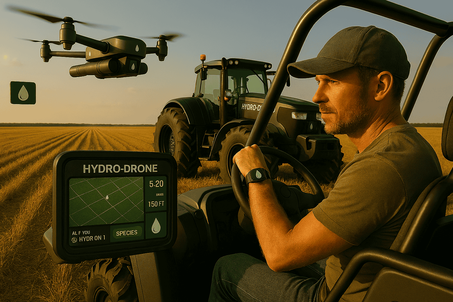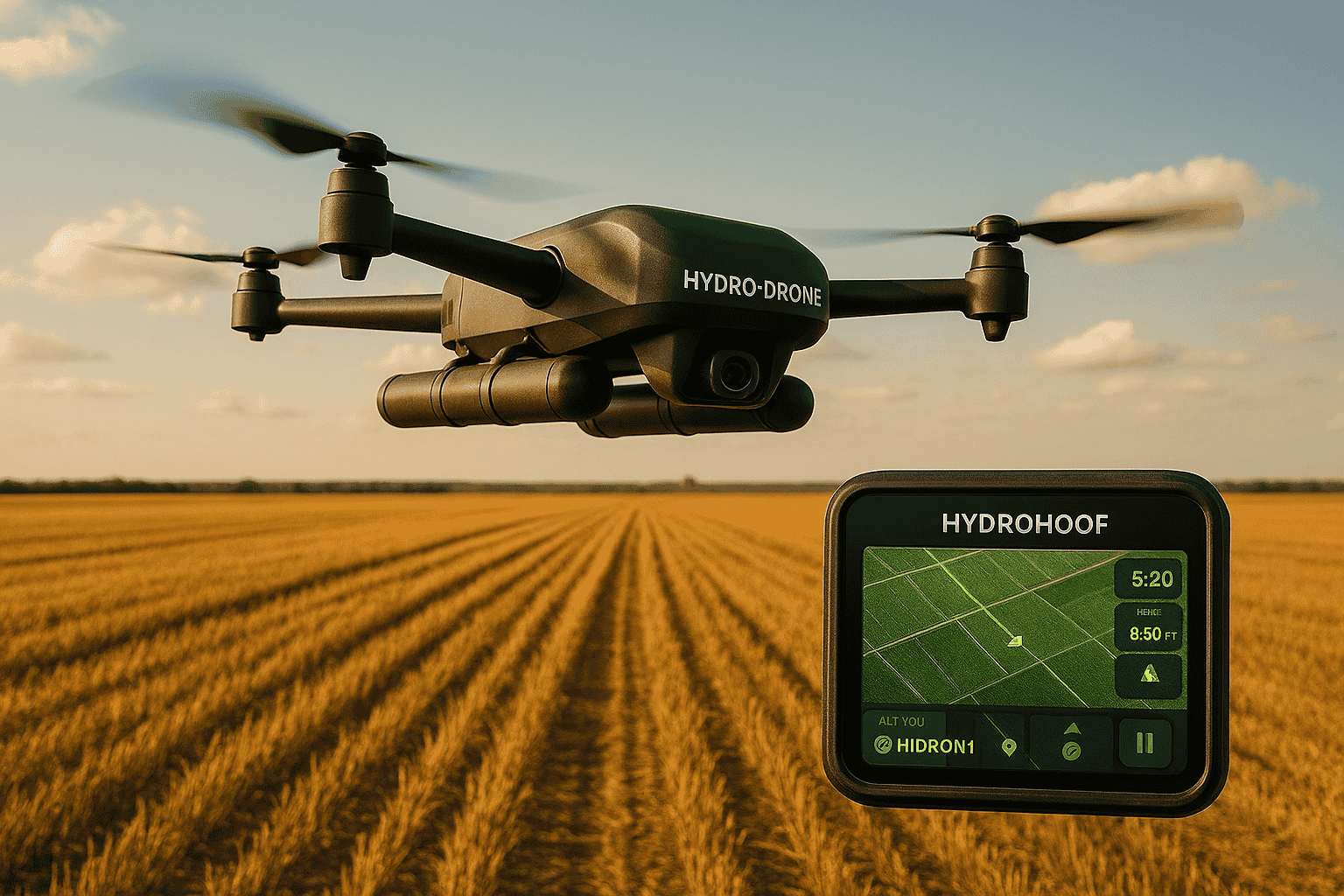 Hydro‑Drone: Aerial Intelligence for Modern Agriculture The Hydro‑Drone provides real‑time aerial mapping, hydration analysis, and environmental monitoring across fields and orchards. It autonomously scans the land, identifies dry zones, evaluates crop health, tracks livestock movement, and sends live data to the HydroHoof™ dashboard. With species‑based overlays and precision flight paths, the Hydro‑Drone guides the Rover and Tractor, creating a fully integrated agricultural ecosystem.