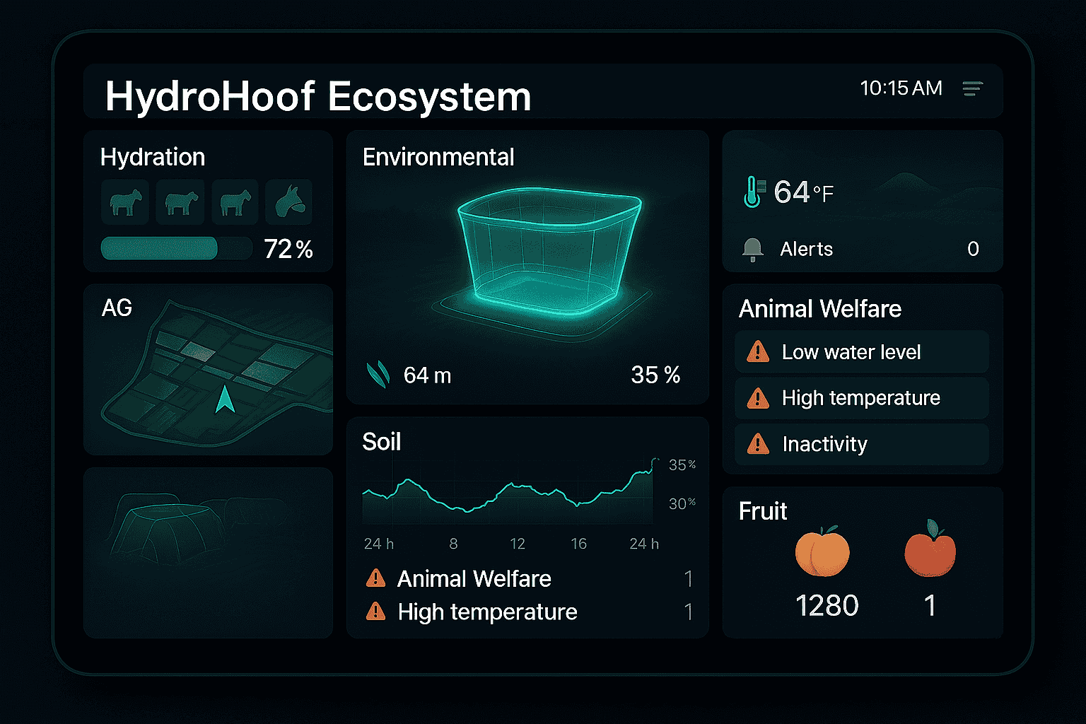 This ecosystem is built for farms, orchards, ranches, and mixed‑species environments where land health and animal well-being are inseparable. By combining aerial mapping, ground‑level mobility, soil intelligence, and human‑centered tools, HydroHoof‑AG delivers a complete, year‑round operational framework for modern agriculture.
