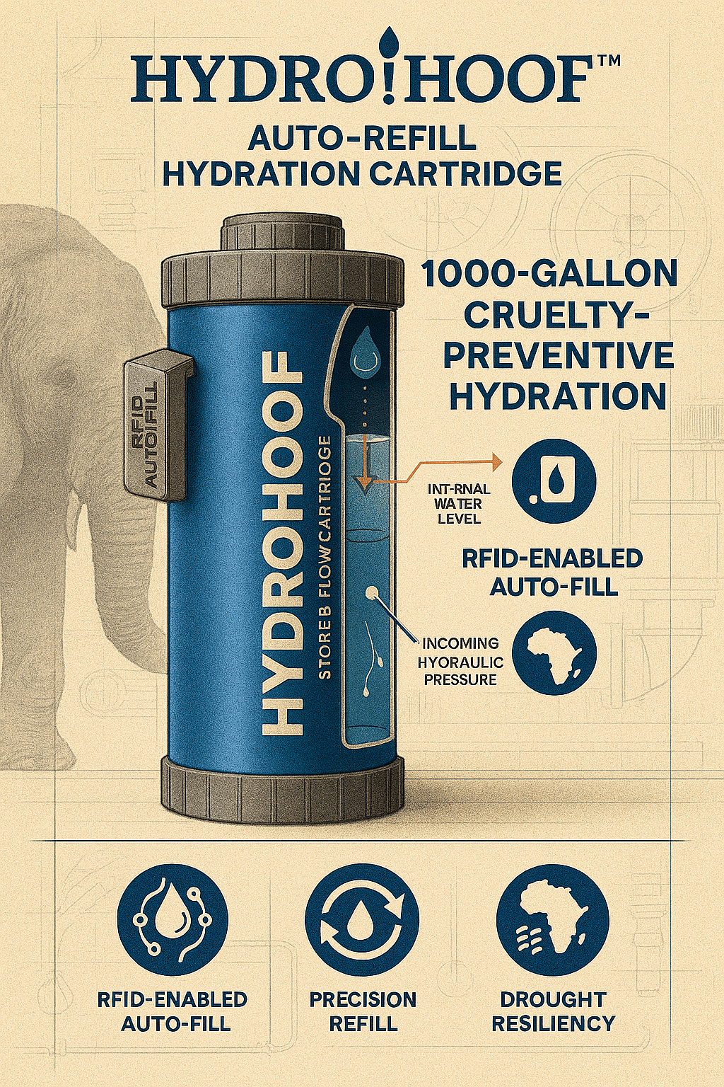 HydroHoof™ cartridges feature internal logic that enables passive, pressure-regulated auto-refill. A modular float valve or sensor detects trough depletion and triggers refill from the 1,000-gallon reservoir. RFID hydration chips log refill events for cruelty prevention and grant-grade traceability. No electricity required and no overflow. Just ethical hydration—on demand.